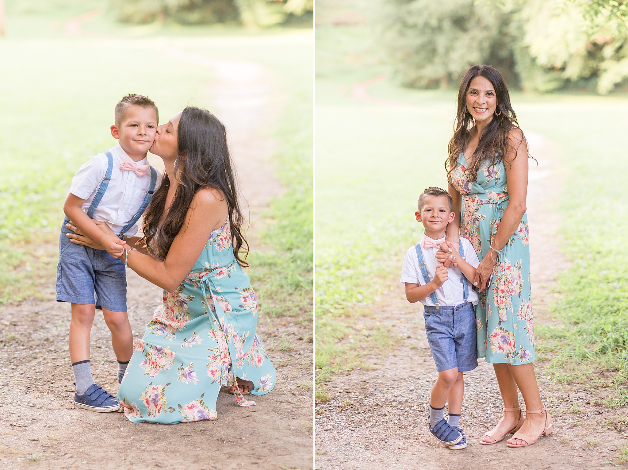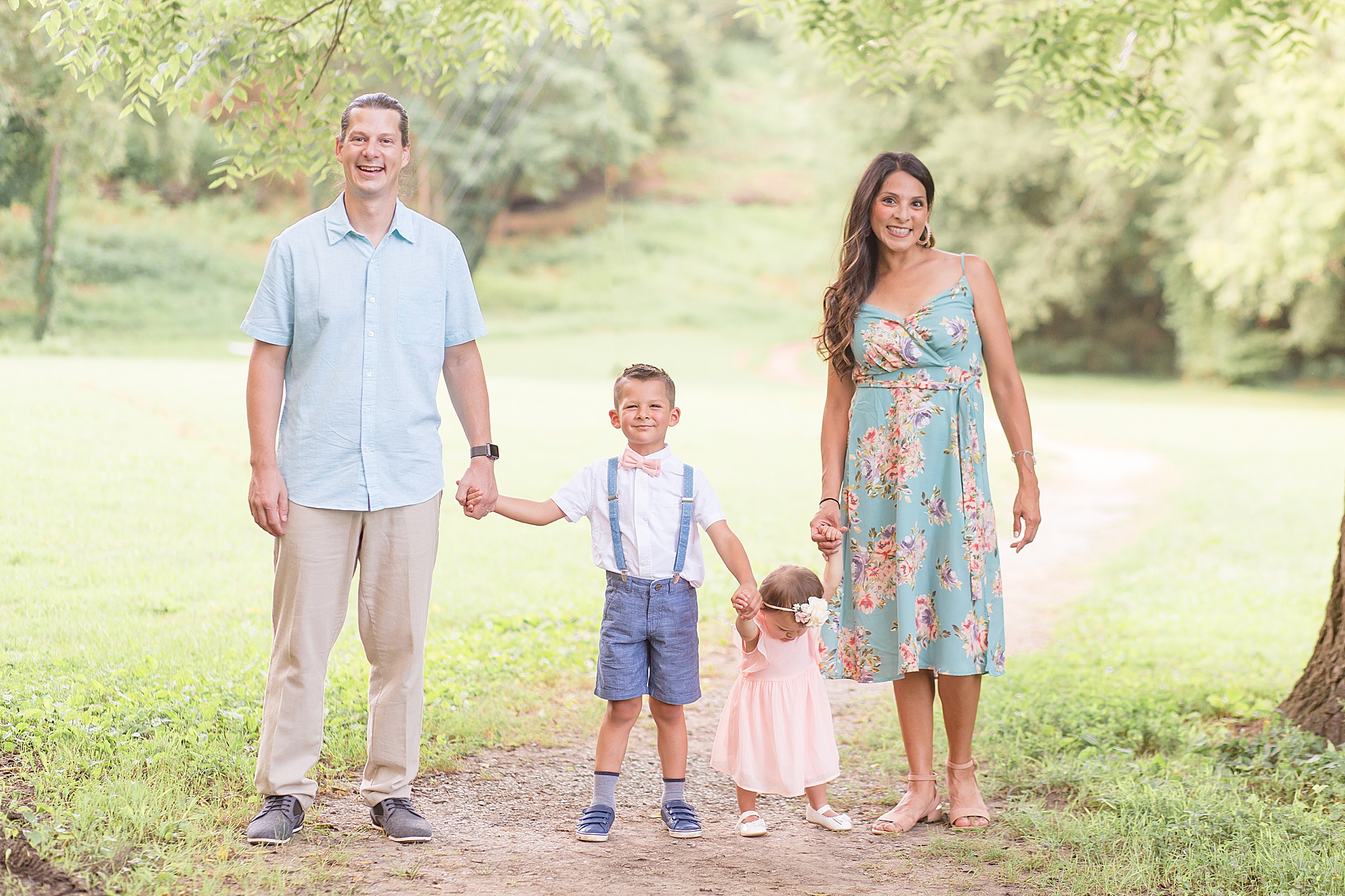 Pinkerton Park is a beautiful little park near downtown Franklin, Tennessee. There's a gorgeous pedestrian trail and other spots throughout the park that turned out to be the perfect backdrop for the Connell's portraits. When they arrived and I saw the outfits that Anabell had planned, I couldn't stop smiling! She and her husband paired perfectly in their light blue options. And the kids looked SO cute!! I still can't get over that adorable flower crown for her baby girl. She brought along a fun hat for herself and some other props we incorporated into the session.