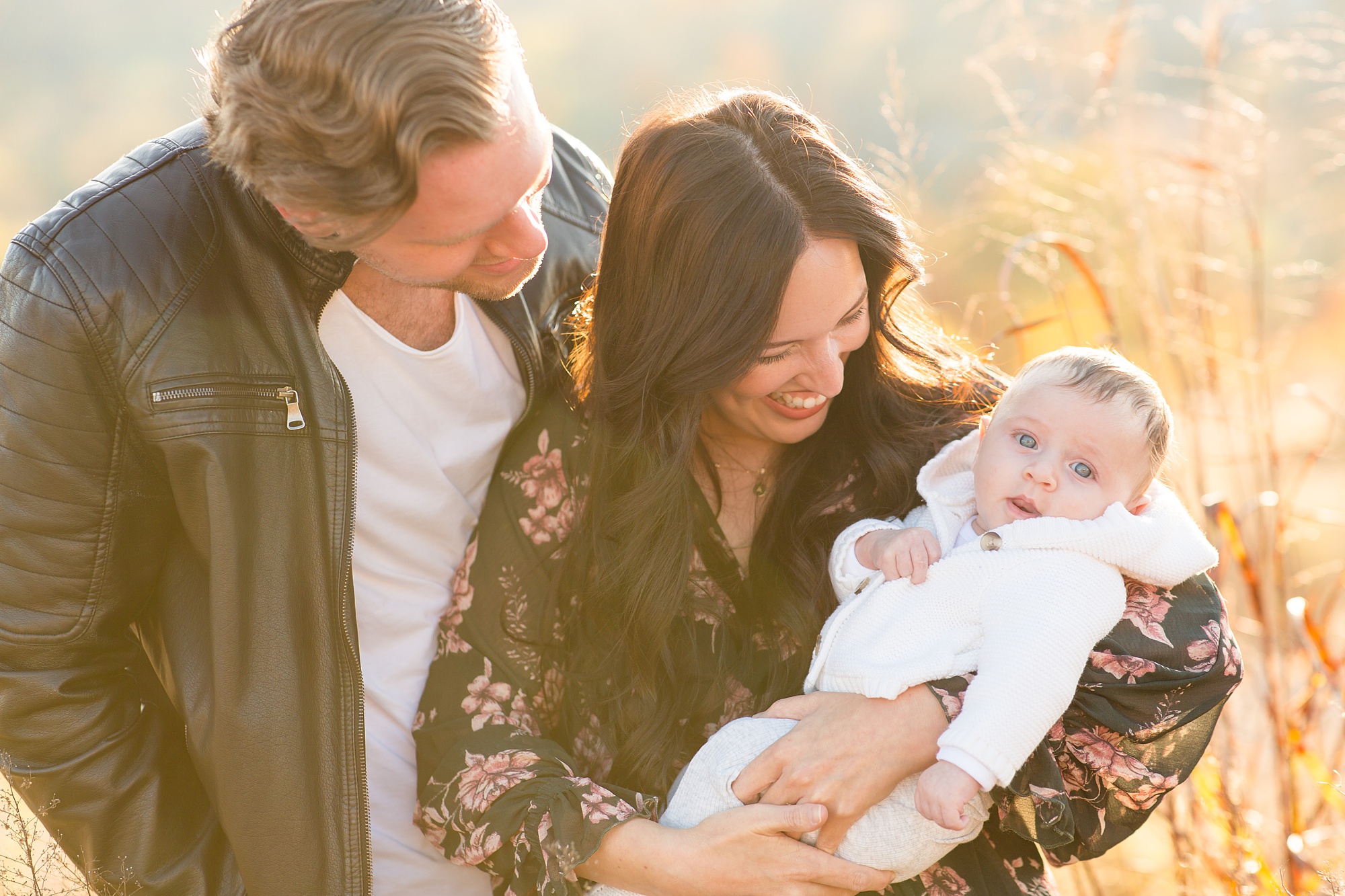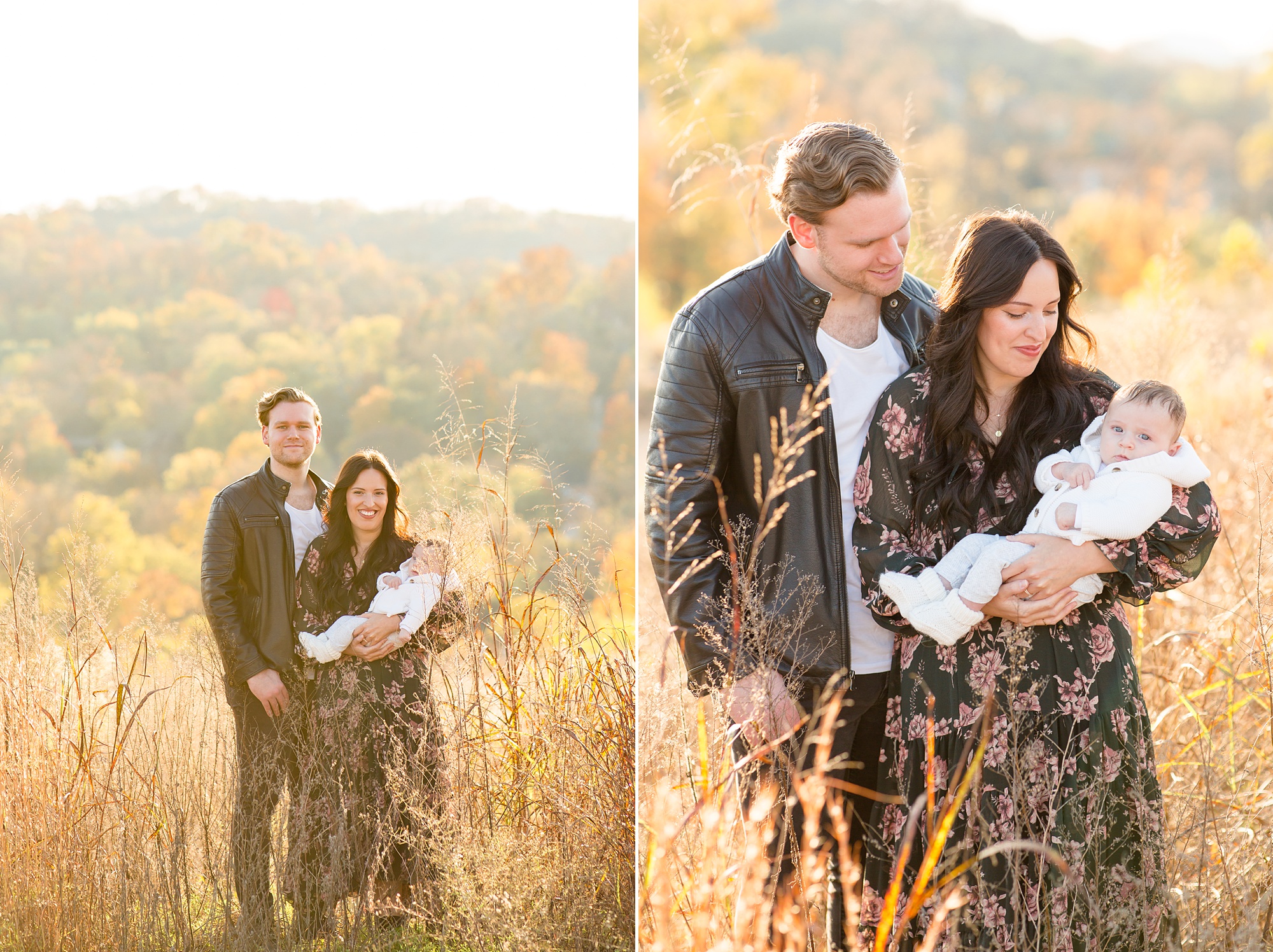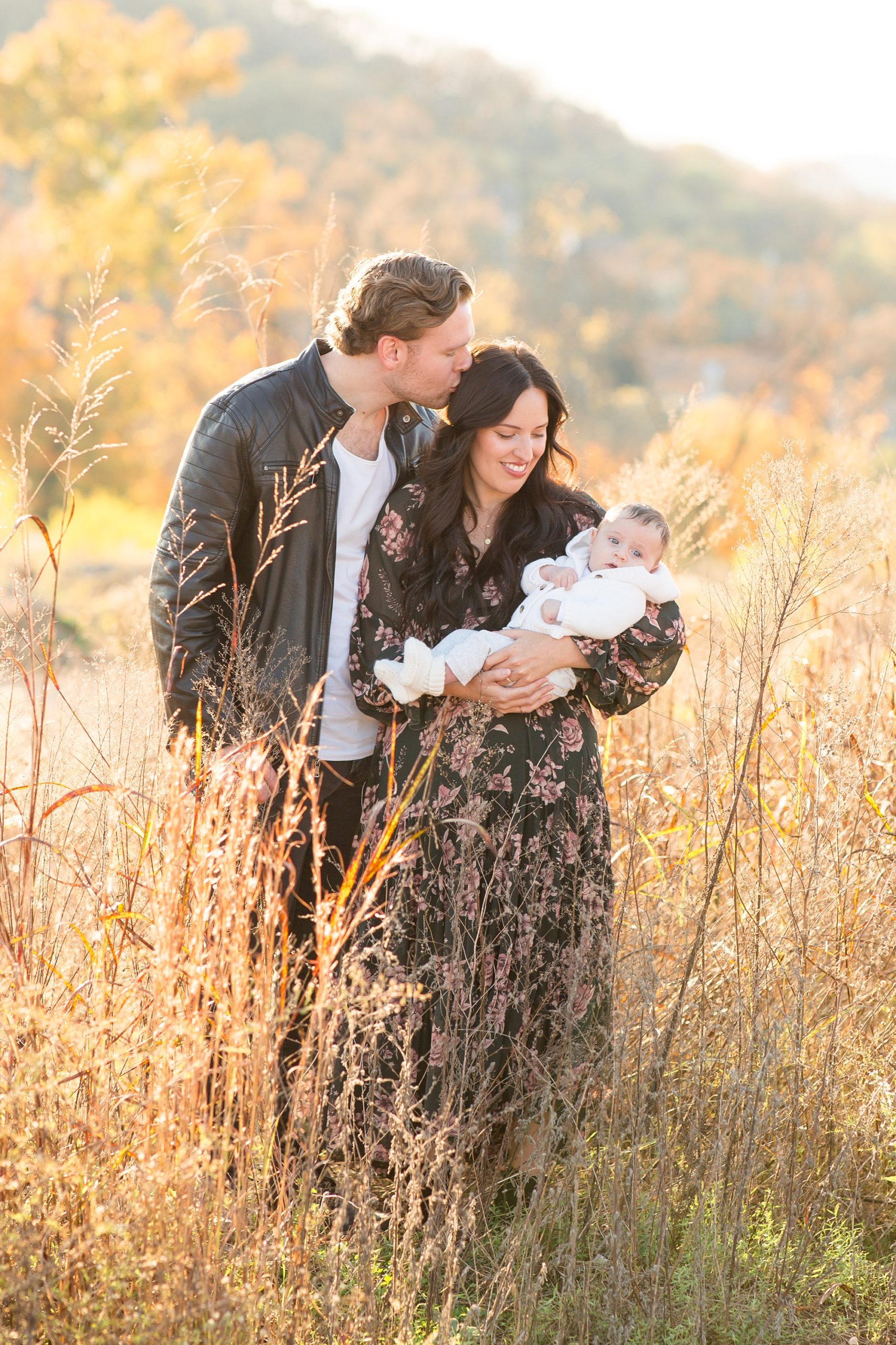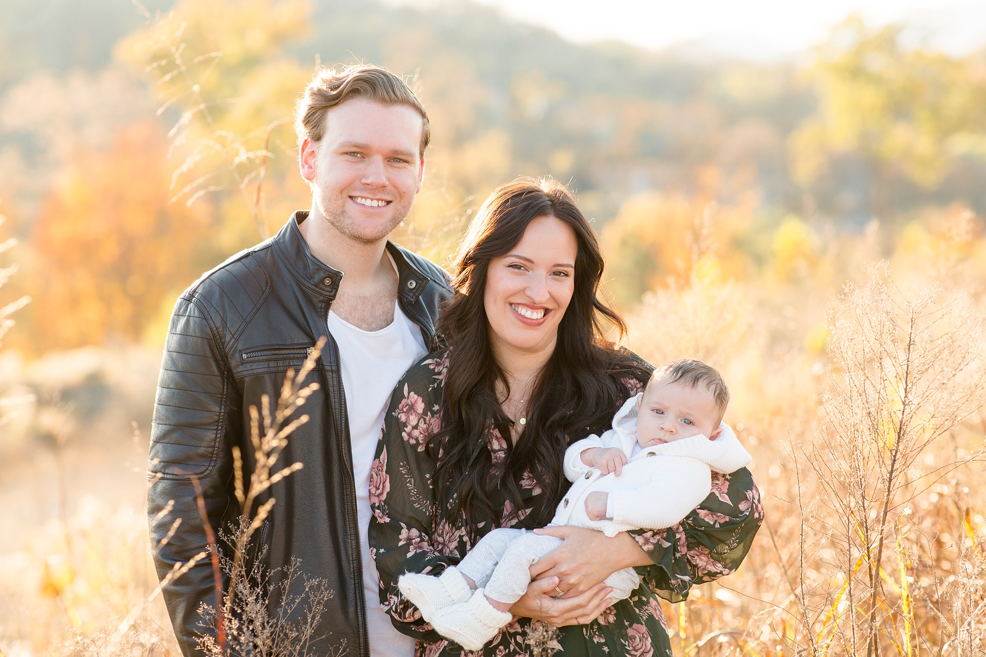 Stephanie and her husband showed up looking like models and with the most perfect glowing light, we captured their fall family session. I'm so appreciative that they trusted me to find the perfect spot (in a cul-de-sac) for the photos. It just goes to show you that anything is possible when it comes to the right light and trusting clients! During our session, I got to see more of the Morris family. I loved learning about them all and watching them with their sweet little guy. He was all bundled up but was great for us! I even got some little laughs and smiles as his parents played with him throughout the session. Capturing new parents with their babies is such a special part of family sessions.