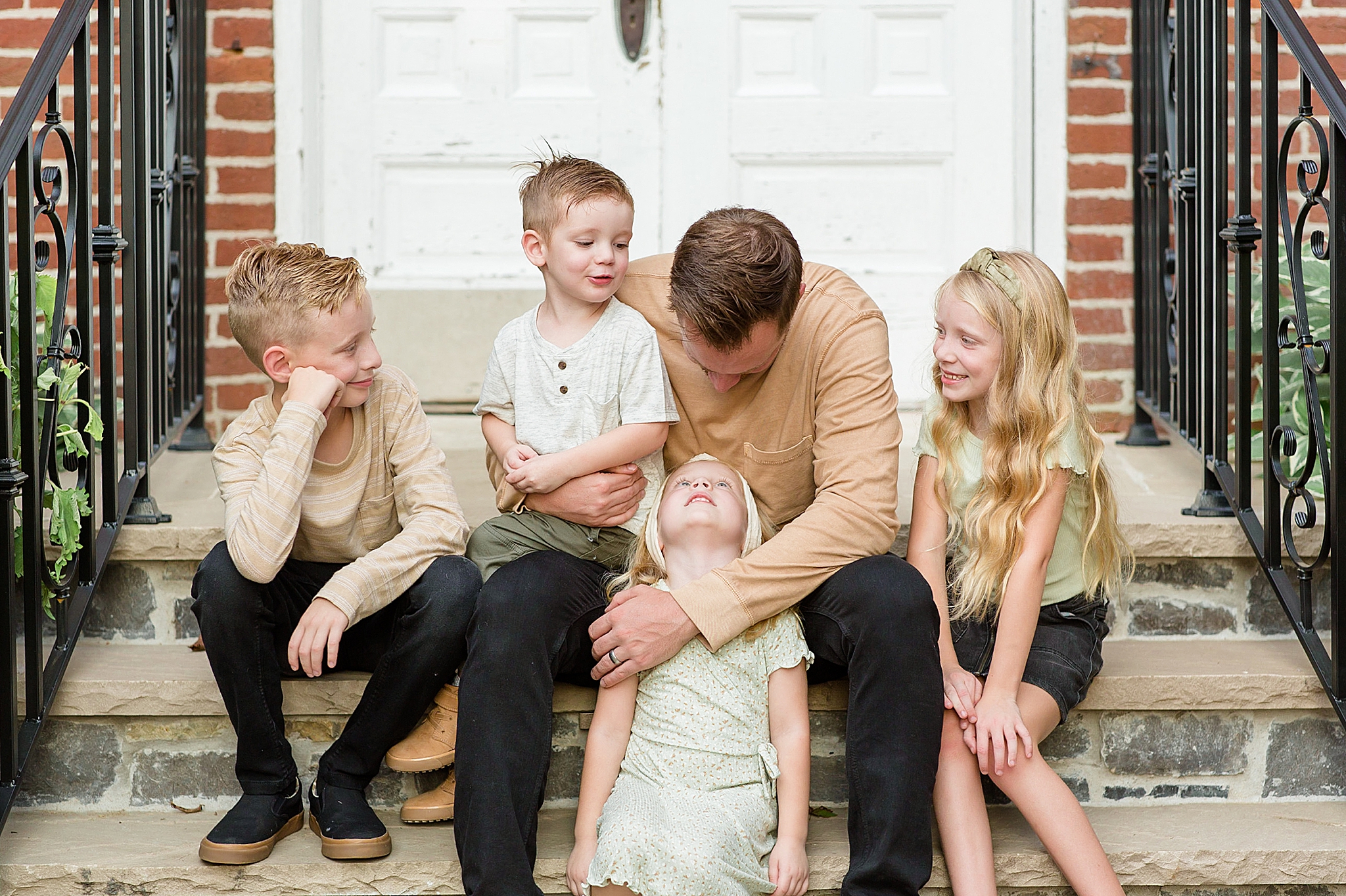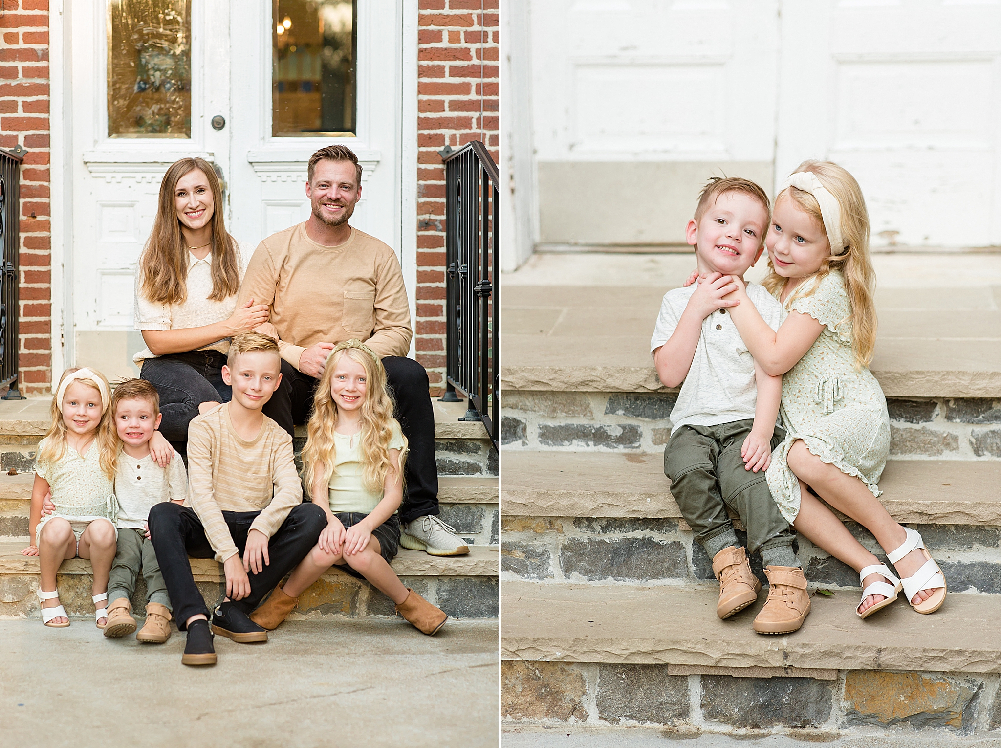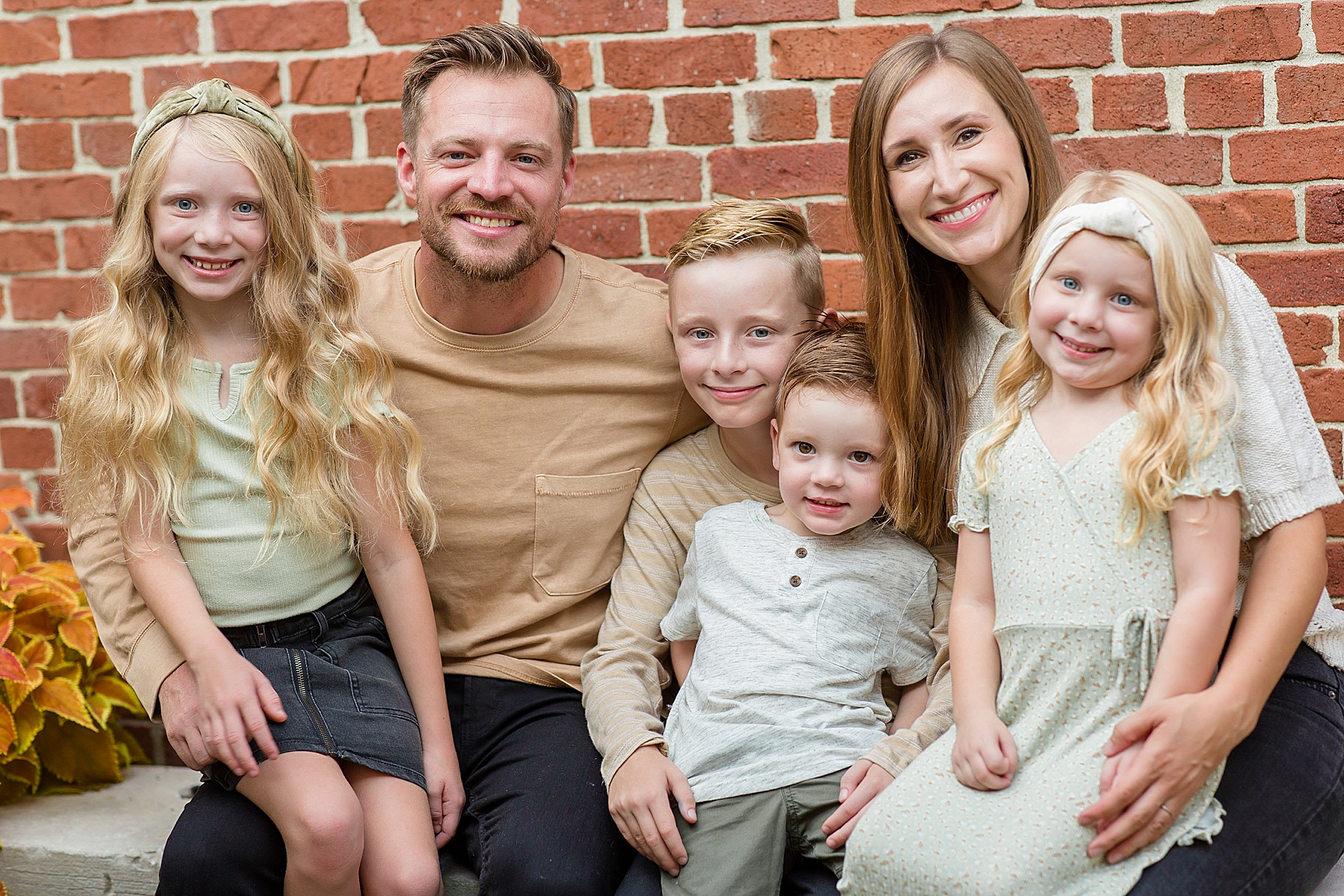 What made the Wallace's family session even more fun was that I had my two little ones with me during the photos. Not only was I capturing these four cuties, but I got to bring my kids with me! Everyone was amazing and we had lots of fun laughing outside the coffee shop. The Wallace Family is seriously just the cutest and I'm still pretty obsessed with these images – especially because of the beautiful outfits they chose. It was the perfect mix of colors and designs. And everything popped against the brick walls, so kudos to this family for choosing a great location AND great outfits!