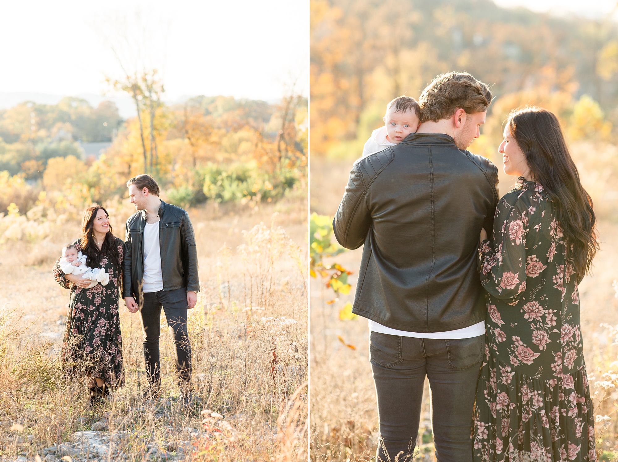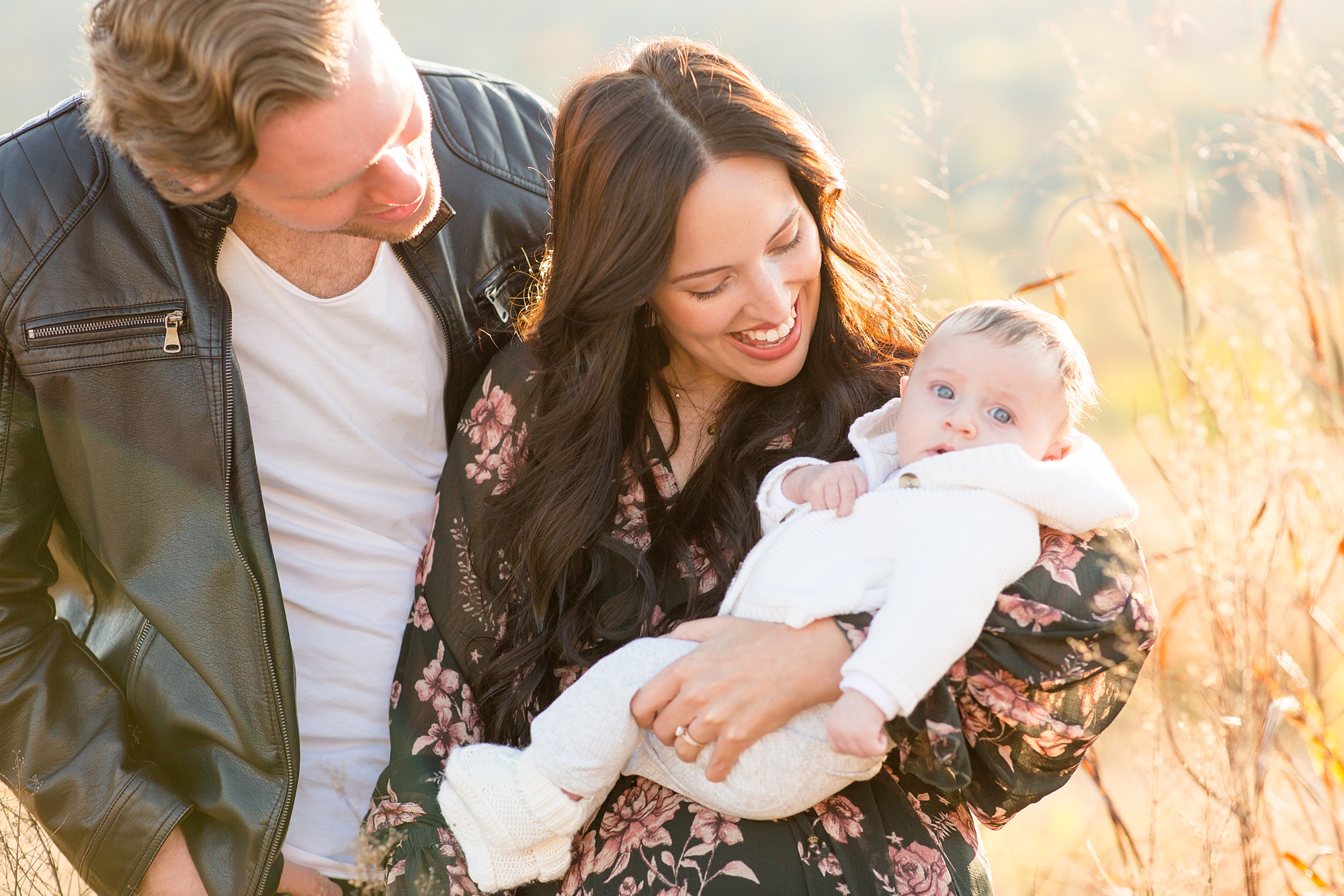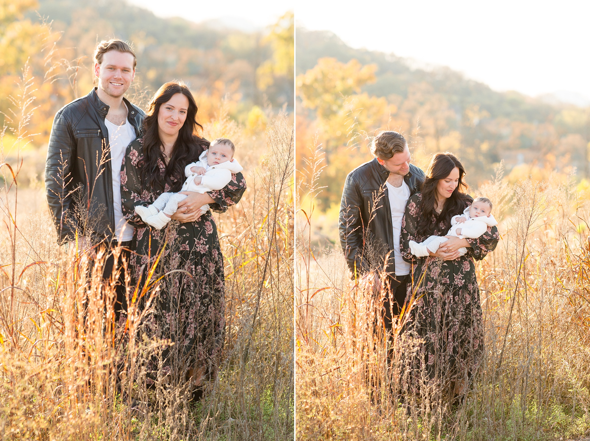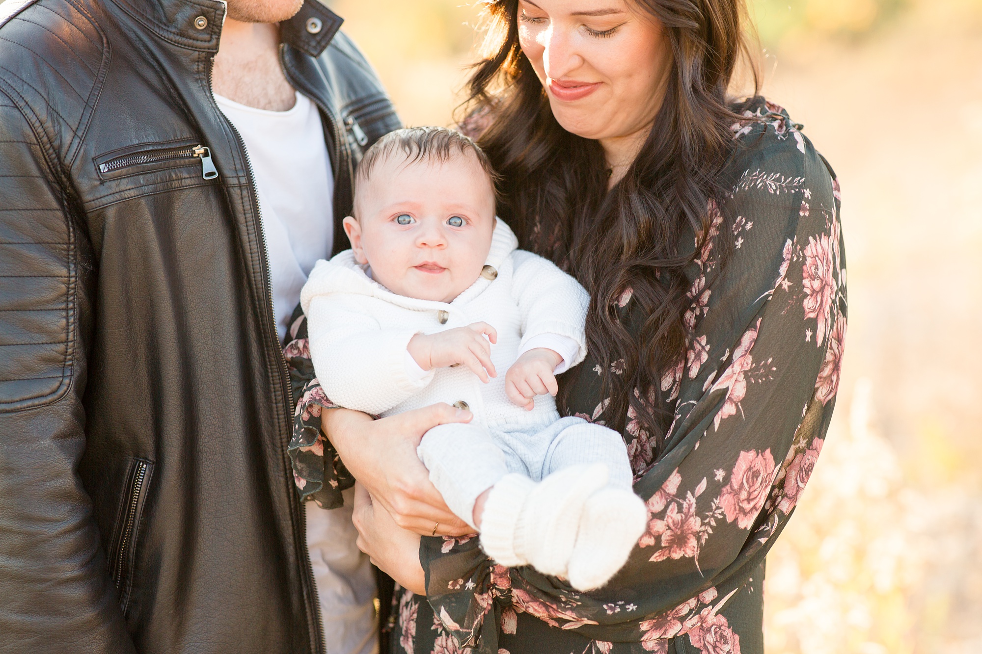 Stephanie and her husband showed up looking like models and with the most perfect glowing light, we captured their fall family session. I'm so appreciative that they trusted me to find the perfect spot (in a cul-de-sac) for the photos. It just goes to show you that anything is possible when it comes to the right light and trusting clients! During our session, I got to see more of the Morris family. I loved learning about them all and watching them with their sweet little guy. He was all bundled up but was great for us! I even got some little laughs and smiles as his parents played with him throughout the session. Capturing new parents with their babies is such a special part of family sessions.