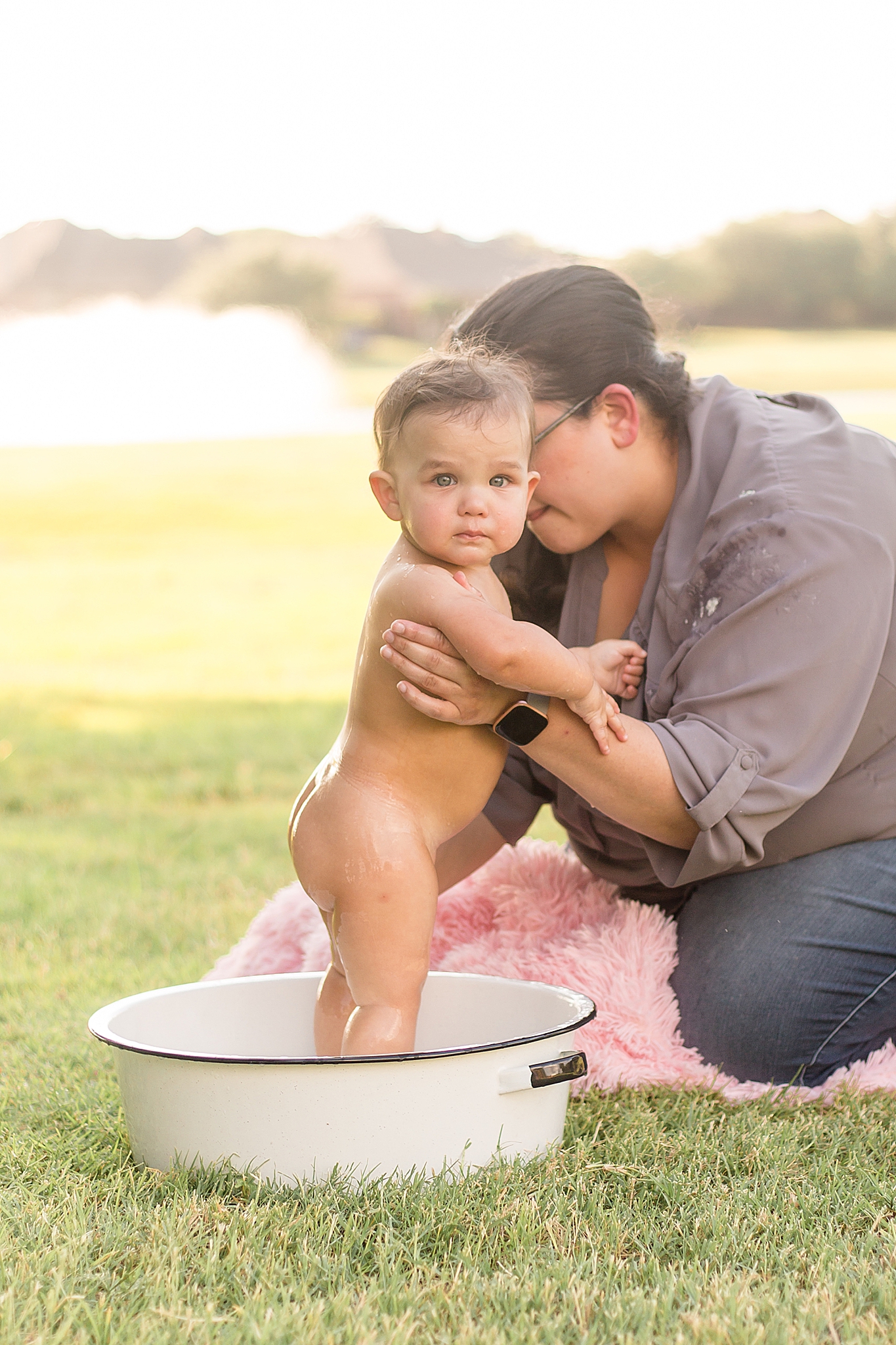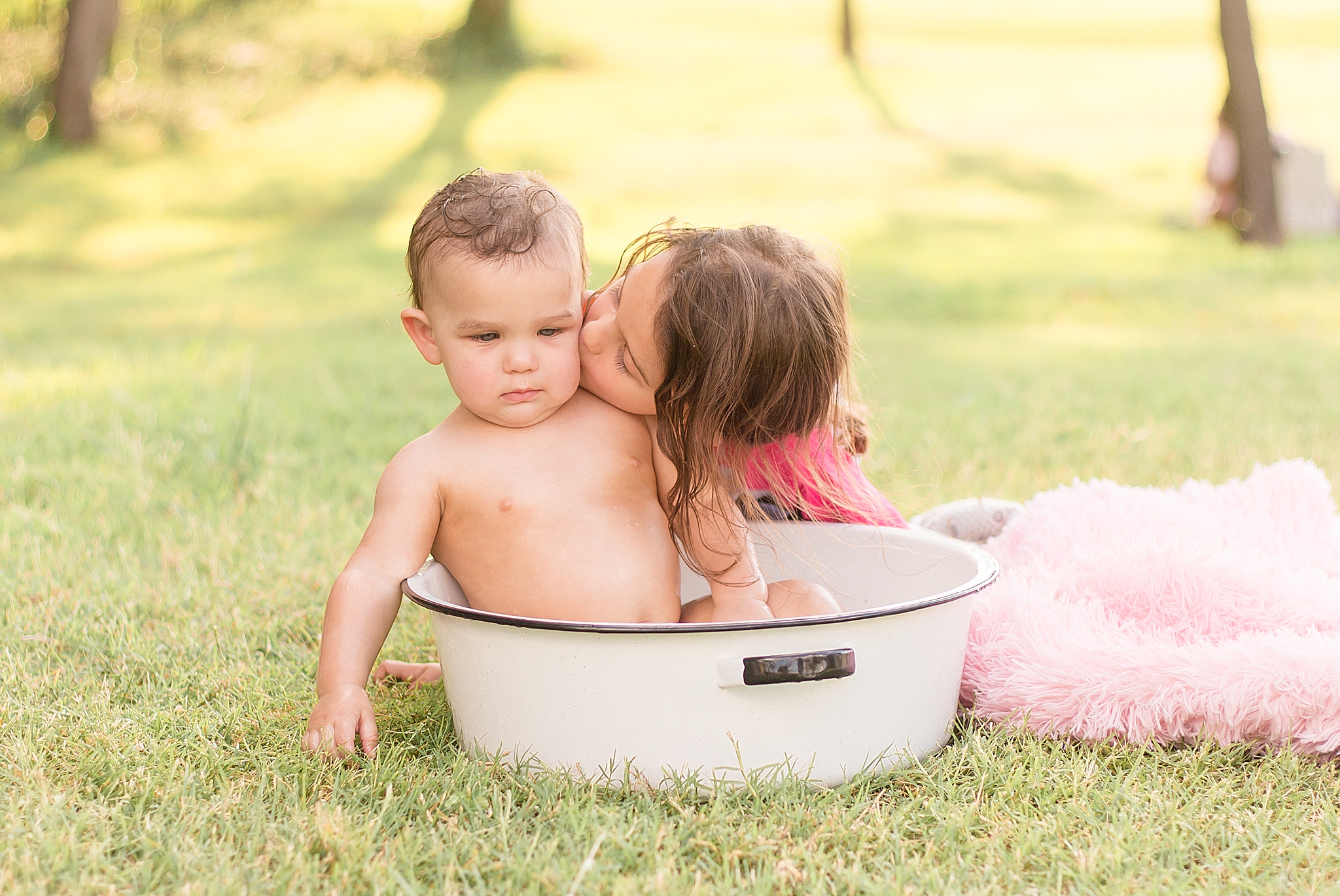 Tatum was a bit nervous around me when we first started our session. I don't blame her – she's a COVID baby, so she hasn't been with too many people. It's okay!! We all had a lot of fun trying to get her into her cake. Once it came out, she wasn't super interested in it – and that's okay, too! No matter how your session (cake smash or otherwise) goes, we'll have a blast and capture some special images! I did manage to get a few smiles out of Tatum – and when the bathtub came out at the end, she was ALL about it. Definitely a water baby!! And Parker was thrilled that Tatum wasn't too into her cake. More for Parker!